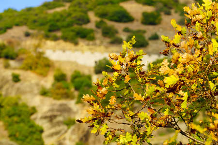 Detailed close up of tree natural leaves on branch. Autumnal nature concept.
