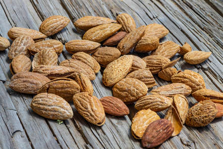 Still life. Heap of almond nuts on a wooden table closeup