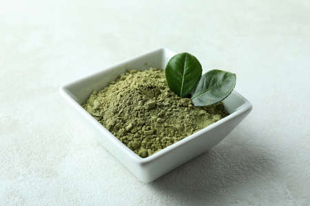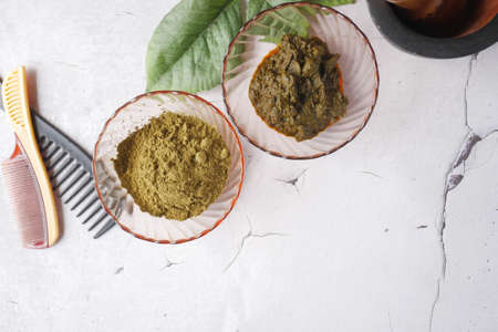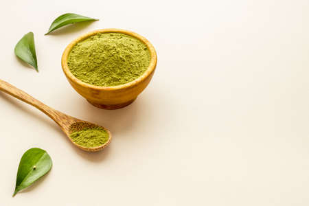 Henna powder in wooden bowl with green leaves. Herbal natural hair dye