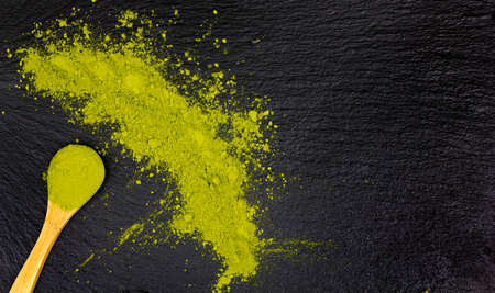 Matcha tea powder on dark background with spoon and leaves with copy space.