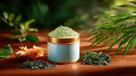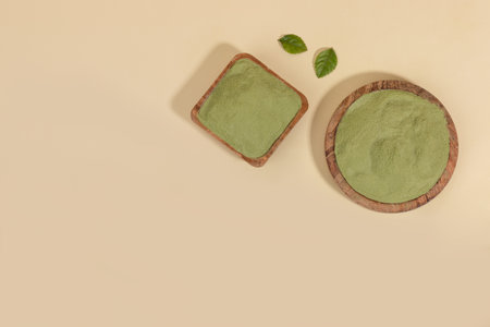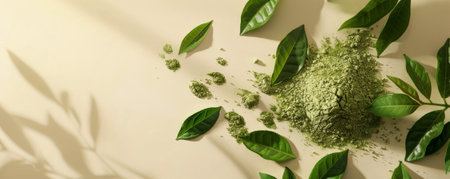 Mockup of matcha tea powder with leaves on a beige background, providing a warm and inviting backdrop for your creative projects.