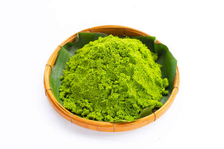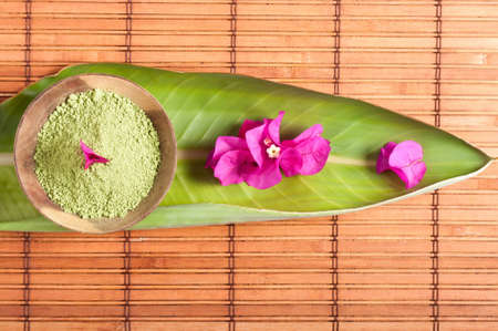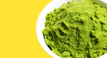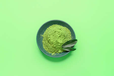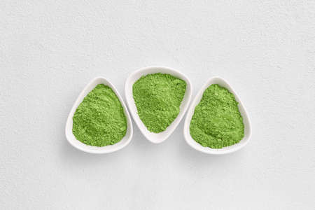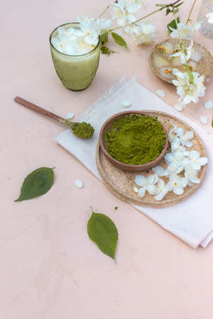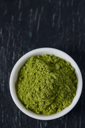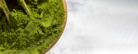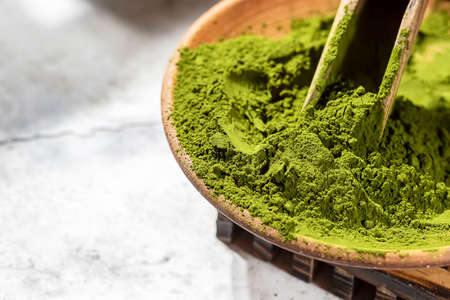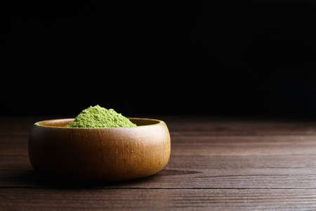 Raw matcha tea powder in wooden bowl. Natural healthy drink