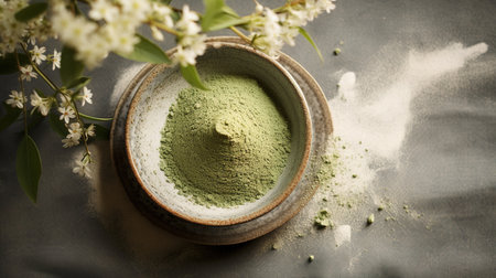 Mockup of matcha tea powder with leaves on a light gray background, offering a neutral and modern backdrop with room for text or graphics.