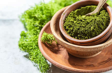 Green powder chlorella, spirulina on gray concrete background. Concept dieting, detox, healthy superfood, which contains protein.