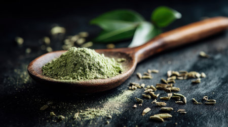 A rustic wooden spoon holds vibrant green herbal powder, surrounded by seeds and fresh leaves. This natural ingredient enhances health and wellness in cooking.