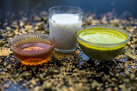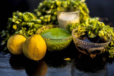 Coriander face mask for glowing skin on black surface consisting of some lemon juice, coriander, milk, and honey. Shot of prepared face mask along with entire ingredients.