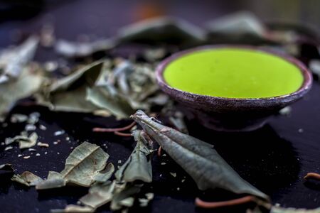 Close up shot of Banyan tree paste in a clay bowl on black glossy surface along with some dried leaf powder or Banyan tree leaves. Grind powder of Banyan tree leaf well mixed with water in a bowl.