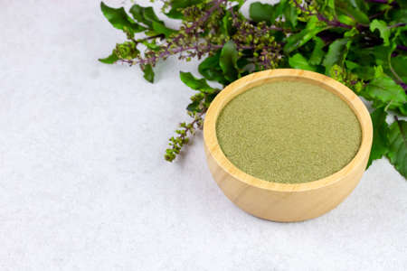 Holy basil powder on wooden bowl with branch on white background. Holy basil leaf are useful herbs and food ingredient has a spicy flavor.