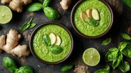 This vibrant image showcases fresh basil ginger pesto served in elegant bowls, garnished with lime slices and ginger. Perfect for culinary inspiration!