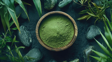 Matcha powder in a rustic wooden bowl surrounded by natural elements like bamboo, stones, and green leaves