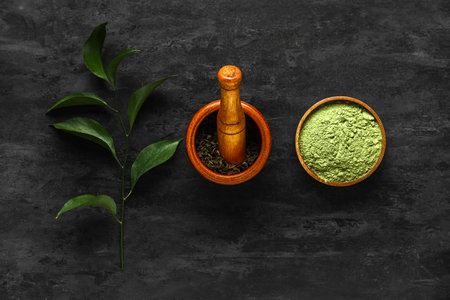 Bowl of powdered matcha tea, mortar with dried leaves and plant branch on dark background