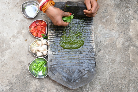 Grinding coriander chutney on stone grinder.Indian Woman hands grinding fresh coriander leaves with garlic, chillies, tomato and Salt on stone grinder. Traditional sauce making.