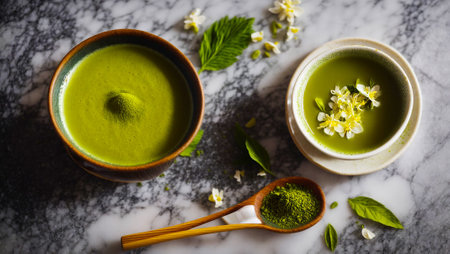 Generative AI, Green matcha tea powder and drink, muted neutral colors. Traditional Japanese tea