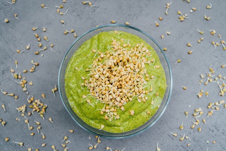 Top view of green smoothie dish in bowl with green buckwheat sprouts. Healthy breakfast. Vegetable dish. Meal full of vitamins. Super bowl