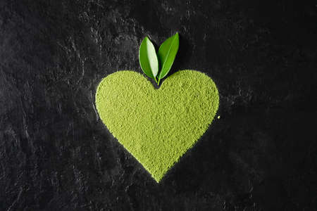 Powder matcha tea in the shape heart on a dark background. Top view.