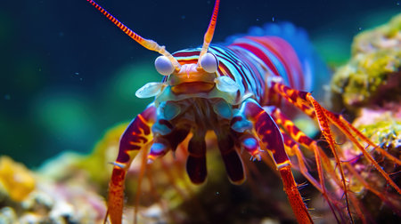 A colorful mantis shrimp with intricate patterns prowls its reef habitat, showcasing its stunning hues and complex anatomy.