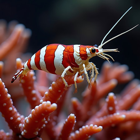 Macro shrimp on coral, translucent texture, marine life closeup