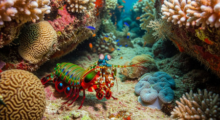 An underwater scene featuring a peacock mantis shrimp amidst colorful coral reefs, its striking appearance adding a splash of brilliance to the vibrant ecosystem.