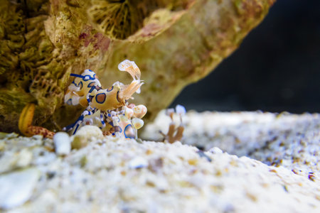 Colorful mantis shrimp on a coral in the aquarium against a dark background. Close-up view.