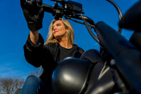 A gorgeous blonde model enjoys the outdoors while driving her motorcycle.