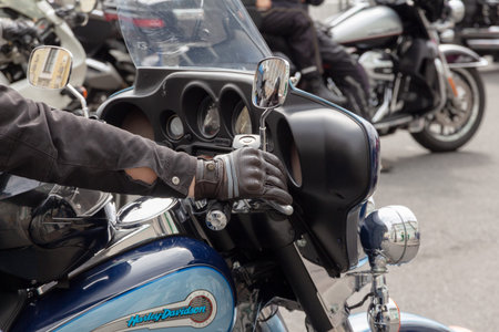 St. Petersburg, Russia - August 03, 2019: Harley-Davidson Motorcycle Festival in St. Petersburg. Harley davidson speedometer and dashboard detail. hand in leather glove on the steering wheel