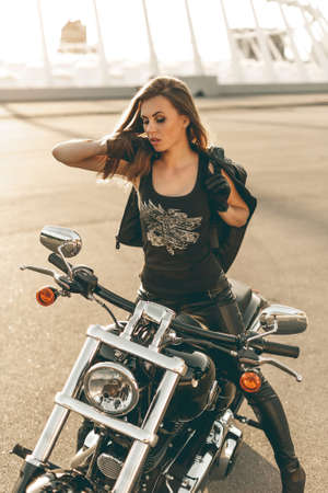 Girl on a motorcycle. She is beautiful, posing on a motorcycle at sunset