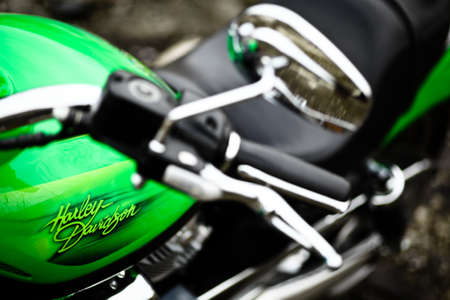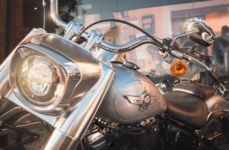 Detail of a Harley-Davidson motorcycle on display in the city of Londrina, southern Brazil. It is one of the most iconic motorcycle brands in the world.