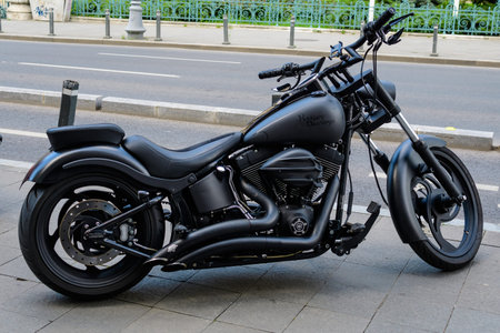 Bucharest, Romania - 6 May 2021: Harley Davidson classic motorcycle parked on a street in a sunny spring day