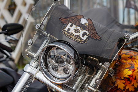 Moscow, Russia - May 04, 2019: Emblem of Harley Owners Group on transparent windproof shield of Harley Davidson motorcycle. Moto festival MosMotoFest 2019