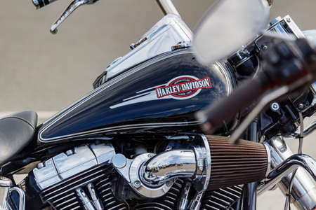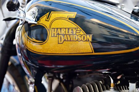 Moscow, Russia - Sept 7, 2019: Harley Davidson logo on a black motorcycle. Harley Davidson is an American motorcycle manufacturer founded in 1903 in Milwaukee, Wisconsin