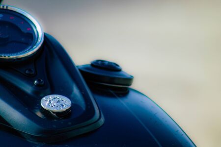 Moscow, Russia - May 04, 2019: Glossy black fuel tank of Harley Davidson motorcycle with emblem and chrome engine closeup. Moto festival MosMotoFest 2019