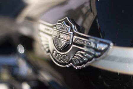 Moscow, Russia - May 04, 2019: Emblem of Harley Davidson motorcycles on the glossy black fuel tank closeup. Moto festival MosMotoFest 2019