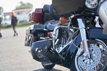 Moscow, Russia - May 04, 2019: Front wheel of Harley Davidson motorcycle closeup on a background of sport bike. Moto festival MosMotoFest 2019