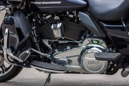 2022 Harley-Davidson Road Glide Limited Motorcycle on asphalt parking at spring day - close side view on engine