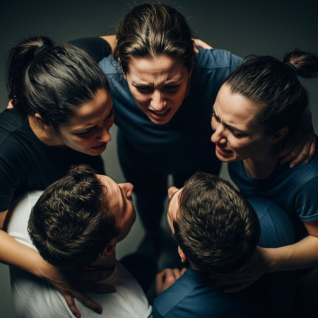 High angle top-down cinematic photograph capturing the intense, emotional rehearsal of a stage play