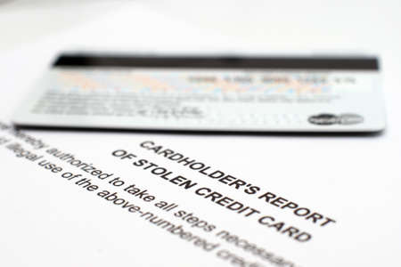 Woman hand hold credit card touch laptop with Security warning in graph Screen code of a media screen on the White background, Technology Process System Business and hacks online concept, Copy space