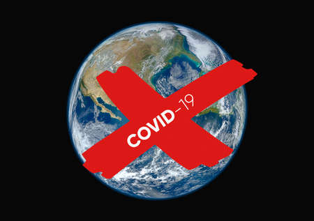 A smartphone with new normal after covid19 message with world map on the medical face mask on grunge red