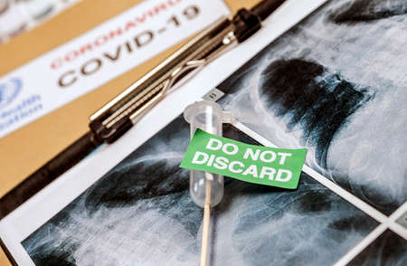 Swab with dna from a covid-19 infected person on a hospital chest x-ray, conceptual image