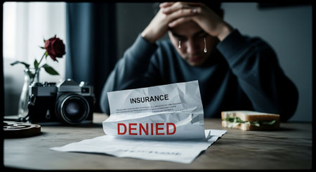 Red Handle Rubber Stamper and Denied text Isolated on wooden table background