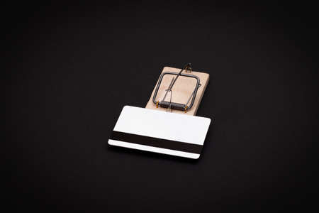Credit Risk and Loan Trap - White Blank Credit Card Template in Wooden Mouse Trap on Black Background