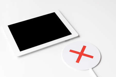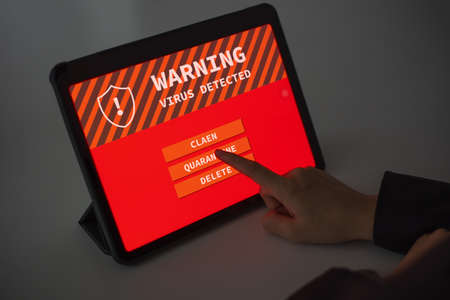 Woman working with tablet with virus warning notification on screen and is choosing a management method from the options clean, quarantine, delete. Virus alert warning and secure on mobile device concept.