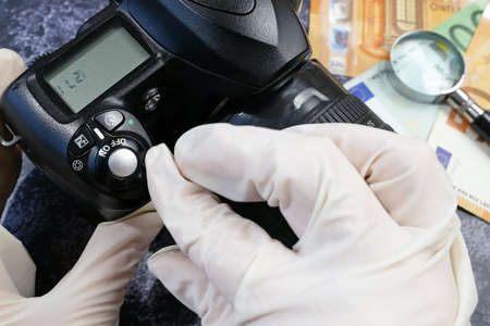 digital camera and money, store selling photographic equipment, pawnshop, closeup