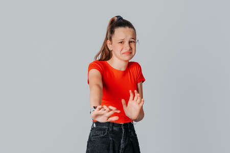 The young girl, crossing her arms, shows a forbidding gesture. Stop domestic violence.