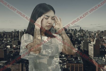 Stressed woman holding head with hands on abstract city, megapolis background. Double exposure. Virus alert, coronavirus pandemic, COVID-19 epidemic. Lost job, fired, worried about family, health.