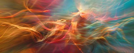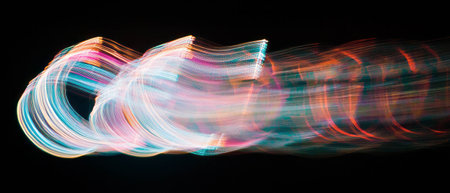 Dynamic light streaks create an abstract pattern illuminating darkness with vibrant colors
