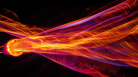 Vibrant streaks of light dance across a deep black canvas, creating a mesmerizing display of motion and energy.