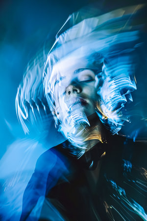 A woman is captured with a motion blur effect that creates a surreal visual. The background features soft lighting, enhancing the artistic atmosphere of the moment.