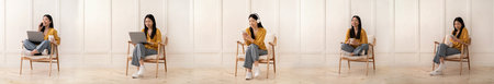 Japanese Lady Relaxing In Armchair With Laptop And Smartphone Indoor