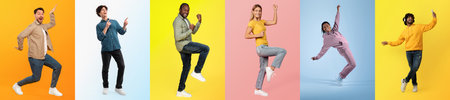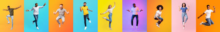 Celebrating diversity with joyful people jumping against vibrant backgrounds