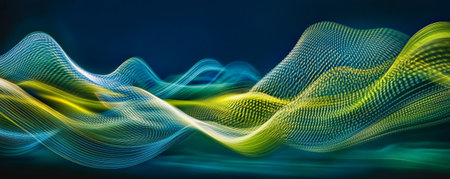 Green and blue light wave of energy with elegant glowing lines. Abstract technology background.
